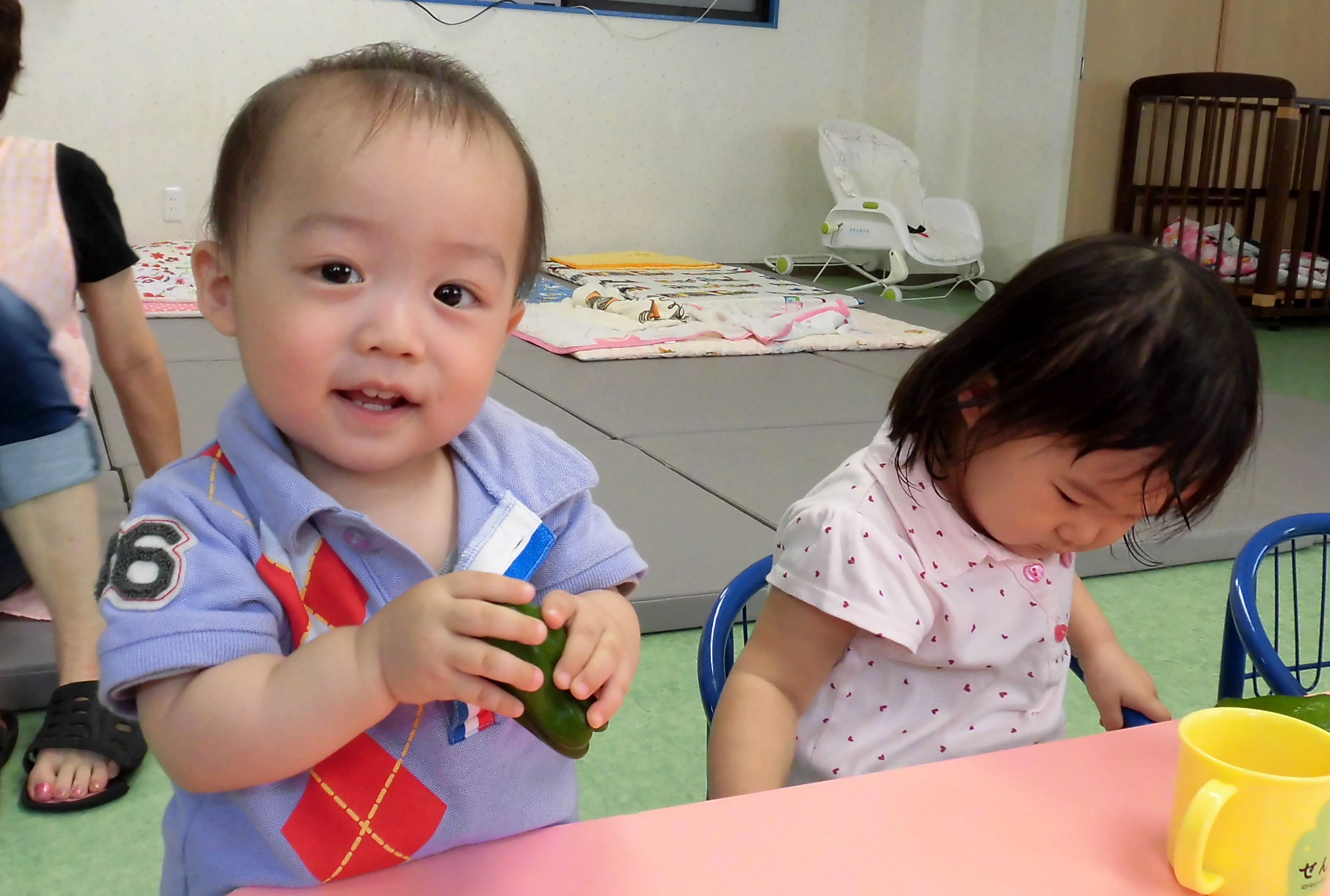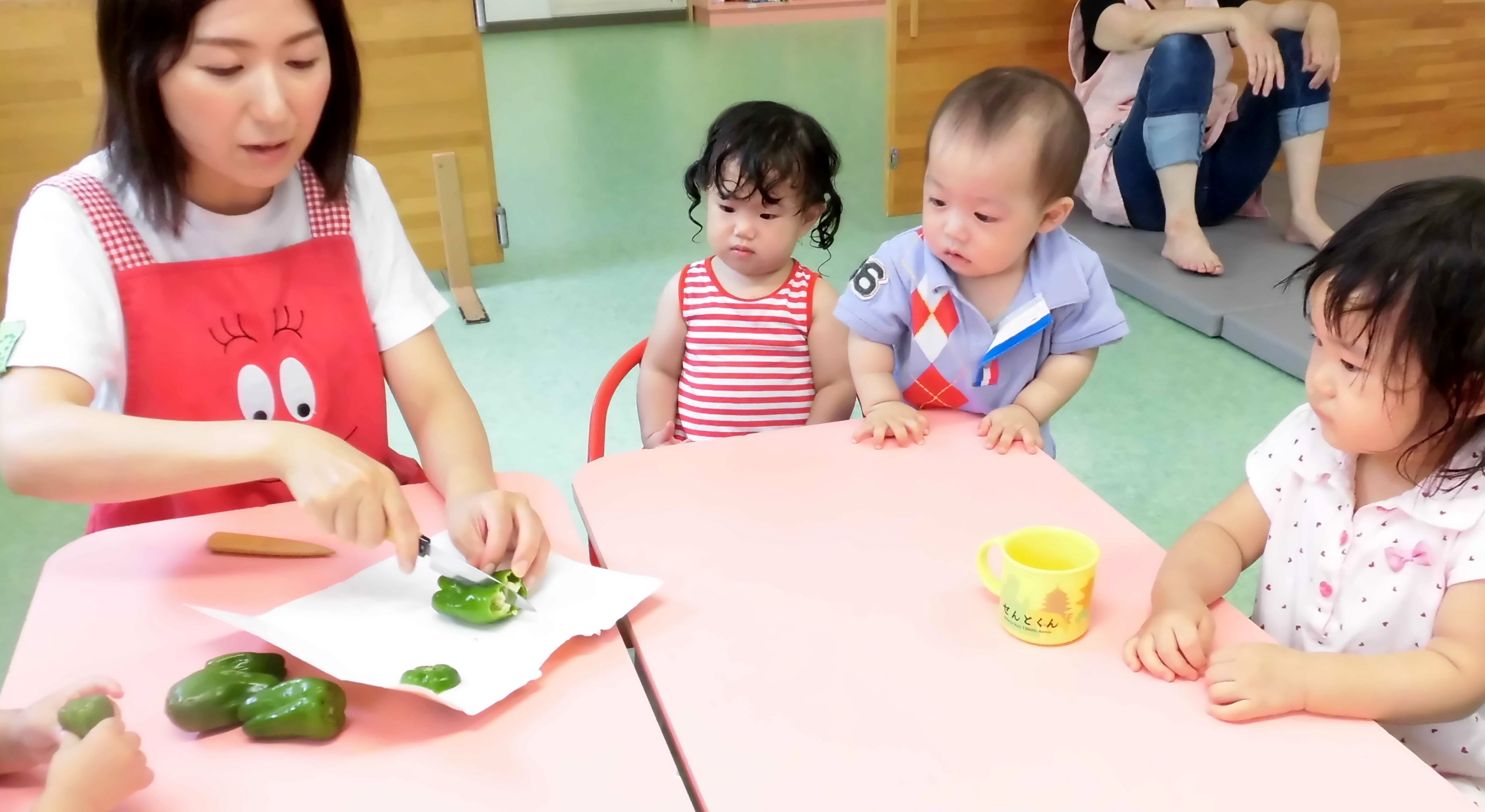 食育の一環でピーマンを切った写真と
